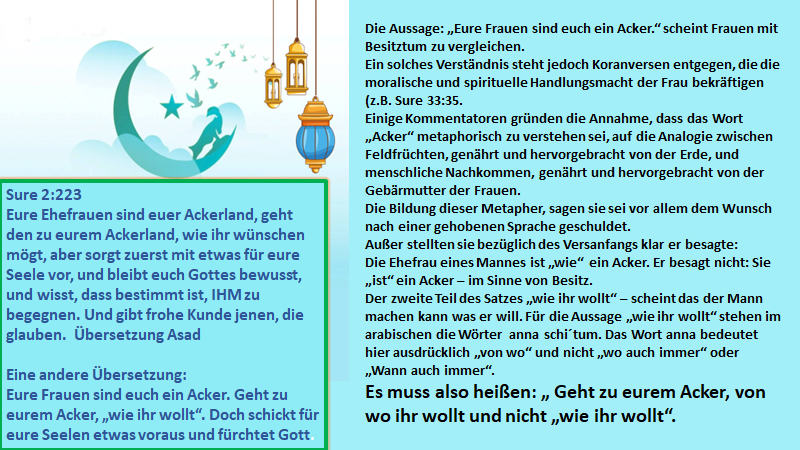 Wird aus dieser Sure die Annahme suggeriert, das Männer ihr sexuale Handlungen ausüben wann immer sie wollen, wie sie wollen, wann sie wollen, weil sie Männer sind.